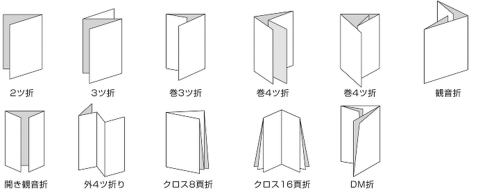 折り加工は下図の、2つ折り、巻3つ折り、Z折り、観音折り、W折りから選択することが可能です。