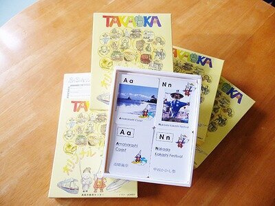 TAKAOKAかるた 作成しました。 小学生がデザインしたオリジナルの箱入りです。 A~Zのアルファベットで高岡市の名所を詠んでいます。