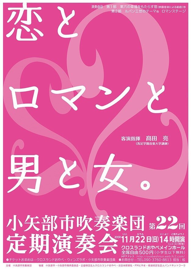 2015年11月21日(土) 小矢部市吹奏楽団様が定期演奏会を開催されます 「恋とロマンと 男と女と」 日時:11月22日(日)14時開演 場所:クロスランドおやべメインホール 毎回楽しいステージが繰り広げられます。 弊社のNさんも出演します。ご来場お待ちしています。