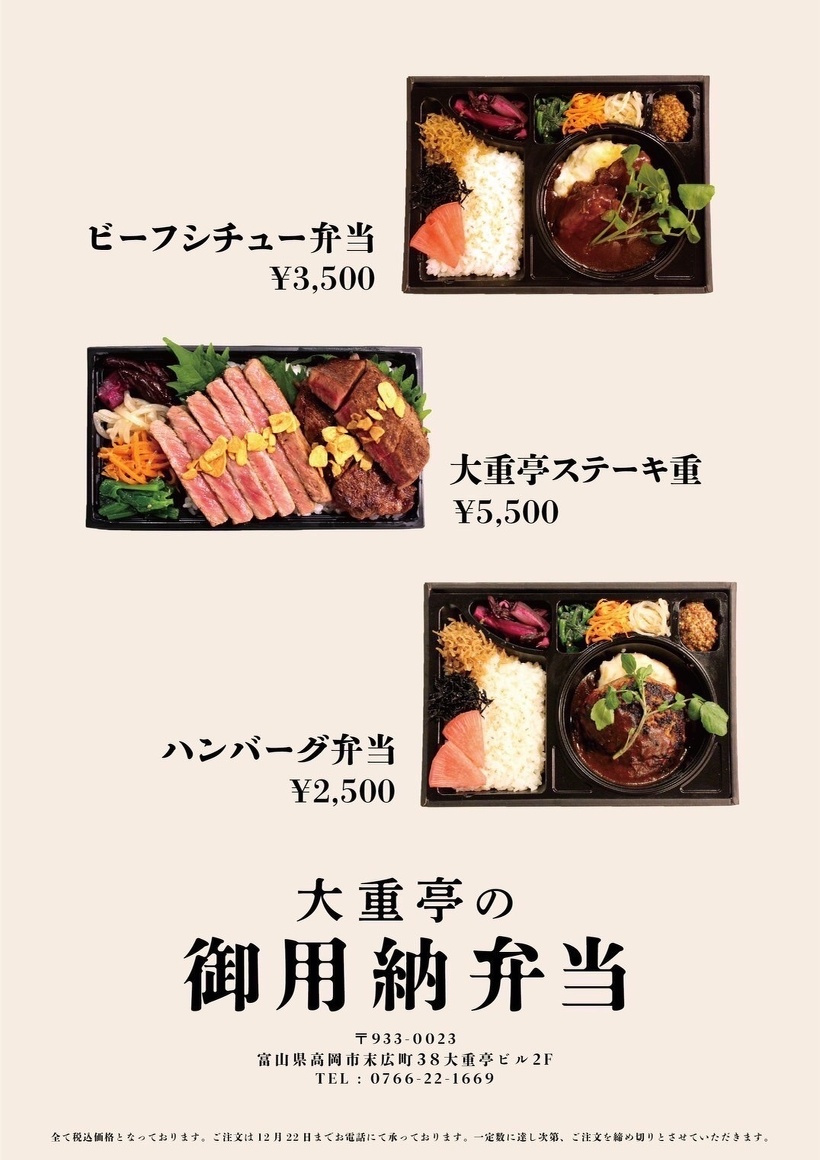 御用納弁当の内容は、ハンバーグ弁当・ビーフシチュー弁当・大重亭ステーキ重の3種となります。御用納弁当とは、年末に「お疲れ様」の意味を込めて用意されるお弁当です。
