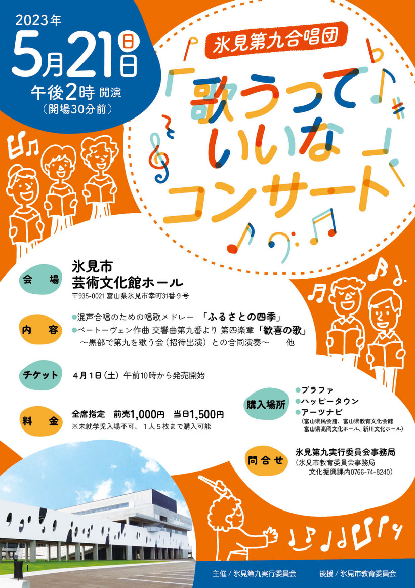 氷見市芸術文化館にて氷見第九合唱団による「歌うっていいな」コンサートが開催されます!年度初めに第九合唱を聴いて気持ちの良いスタートをきりませんか?