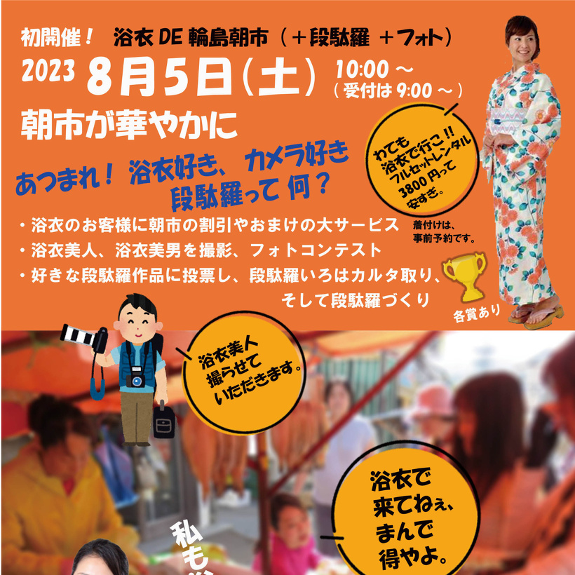 2023年07月10日(月) イベント情報 浴衣DE輪島朝市 2023年8月5日(土)10時から12時「浴衣DE輪島朝市」開催されます。 浴衣を着たお客様に割引などの特典があるそうです。 1000年以上の歴史がある輪島朝市をこの機会にみんなで楽しみましょう。