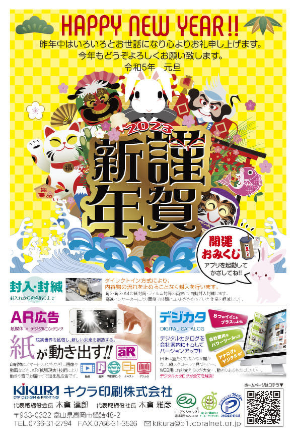 紙に寄り添いつつも、封入封緘、DM発送、動画etc.とエリア拡大中のキクラ印刷を今年もご愛顧を賜りますようどうぞよろしくお願いいたします。